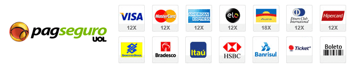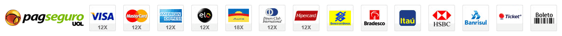 No fechamento de sua compra, você terá flexibilidade para escolher a melhor entre várias formas de pagamento como: Boleto Bancário, Cartões de Crédito Visa, Mastercard, Aura, American Express, Diners, Hipercard ou transferência bancária. É importante realçar que contamos com todos os sistemas de segurança necessários para garantir a confidencialidade de seus dados.